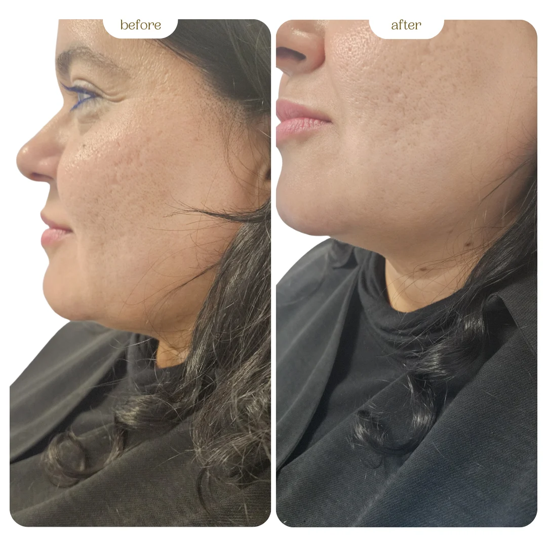 Phase I Enzymatic Fat Reduction with PB Serum: We start with a course of targeted PB Serum injections. Its specialised Lipase enzyme breaks down the unwanted fat cells under the chin, which are then naturally processed by the body.